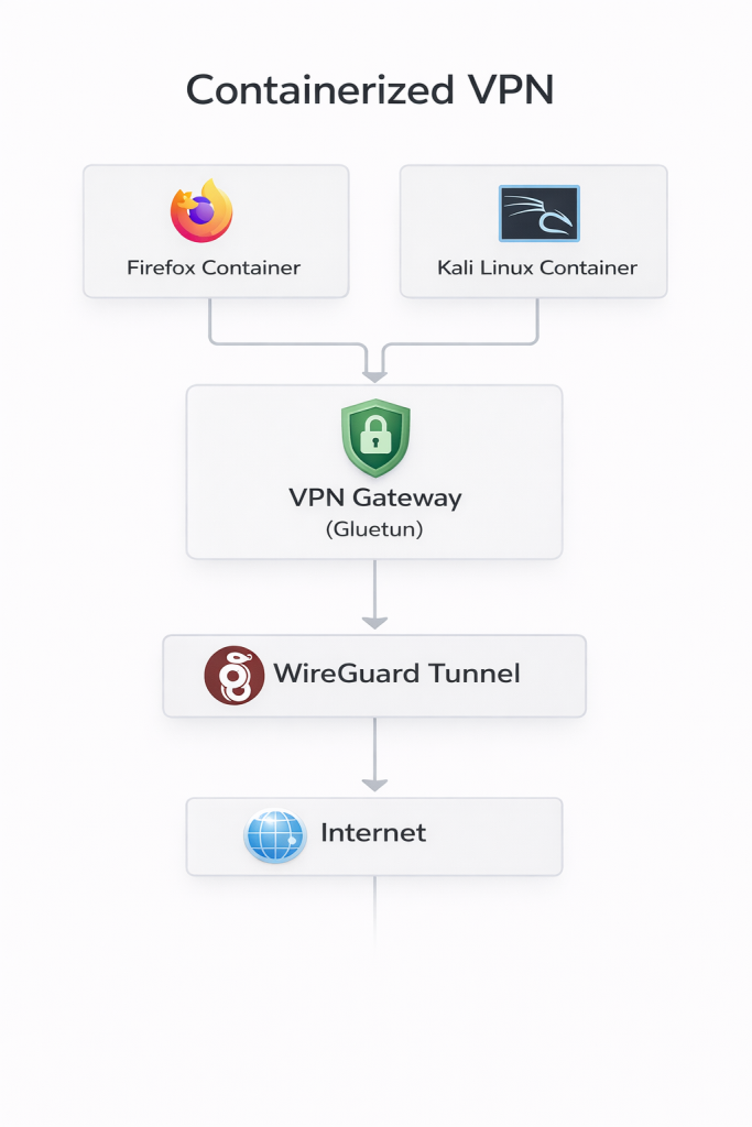 This project isolates workloads inside containers and routes all of their network traffic through a dedicated VPN gateway.