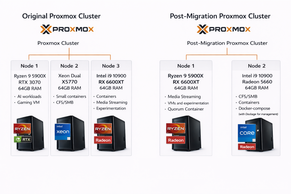 Later consolidated the cluster to two nodes and added a quorum container. Proxmox clusters require a majority vote to safely make changes and without quorum the cluster will refuse operations. The quorum container acts as a lightweight third vote so the two physical nodes can continue operating normally.